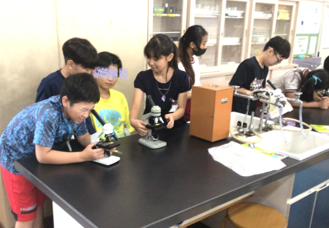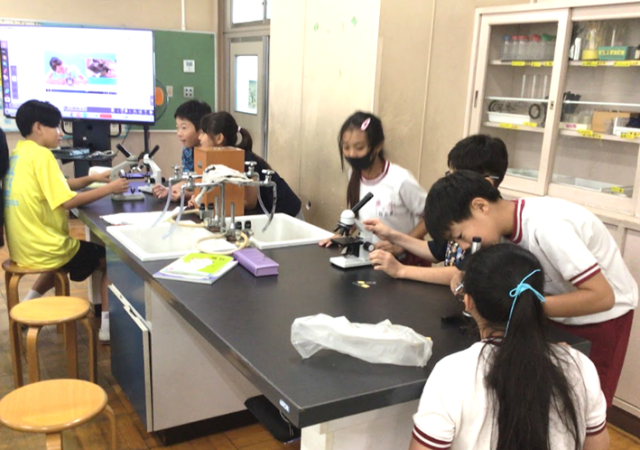 顕微鏡を使って観察を行うために、今日は顕微鏡の使い方を学習していました。顕微鏡をのぞき込むと、そこにはミクロの世界が輝きを放っています。サンプルのプレパラートを交換しながら、自然が作る造形の美しさや不思議さに歓声をあげていました。