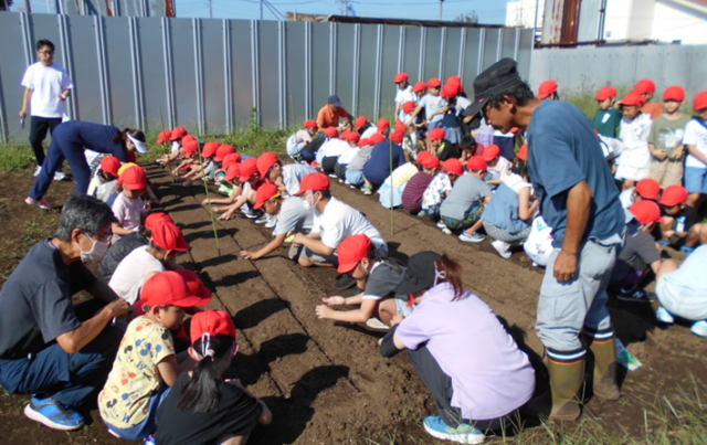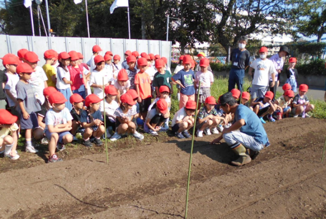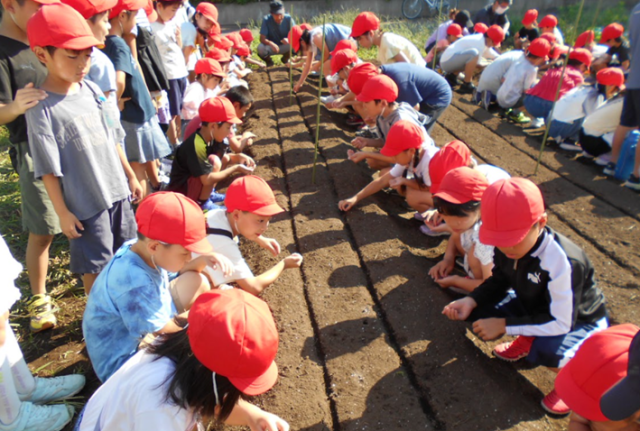 夏にはたくさんのきゅうり、なす、ピーマンを育てた2年生。今回は学校の敷地外の地域の方にお借りしている畑に、小松菜、ほうれん草、かぶに挑戦です。学校応援団の野菜づくりマスターに教えていただきながら、小さな種を小松菜・ほうれん草は1cm間隔、かぶは2cm間隔に蒔きます。種が小さいのでどこに蒔いたか分からなくなるくらいでしたが、近くの人と声をかけ合いながら協力してていねいに種蒔きを終えました。収穫が楽しみですね。