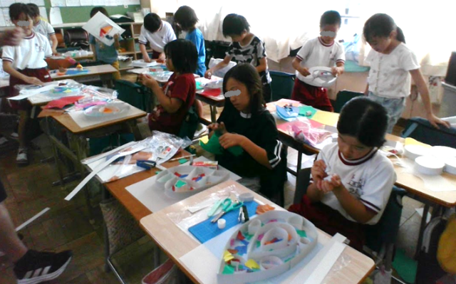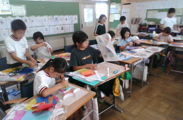 光が差し込む方にかざしながら色紙や形を工夫しています。見る側に貼るとはっきりとした色、反対側に貼ると淡い色合い。素敵な作品が並ぶのが楽しみです。