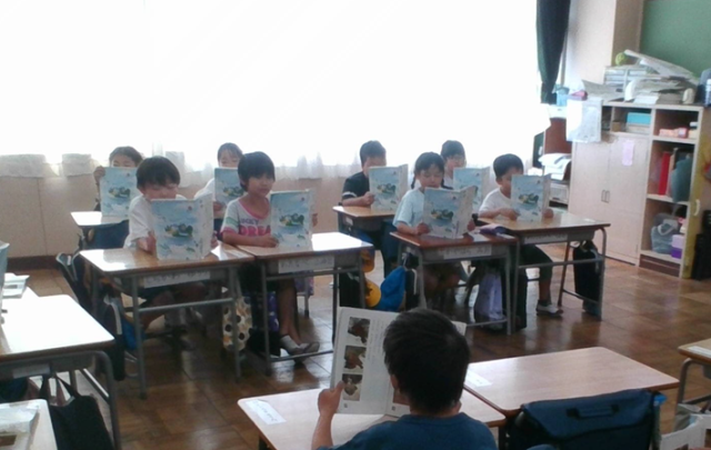 1年生の教室に行ってみると説明文「うみの かくれんぼ」を読んでいるところでした。グループごとに、段落のまとまりごとに読んでいます。お家でもよく聞いてもらったいるのでしょう。誰かの「せーの」の声で、そろって音読が上手にできていました。