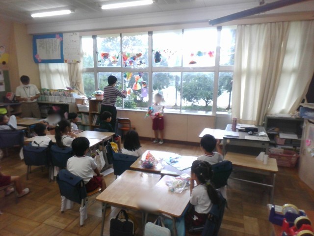今日は、カラフルなフィルムや袋を使って完成させた「ひかりのくにのなかまたち」の作品発表会でした。子どもたちが作った作品はどれも、思い込められたとても素敵な作品ばかりでした。今日は曇っていますが、晴れているときに陽の光を当ててみると、更に素敵に見えそうですね。