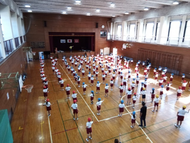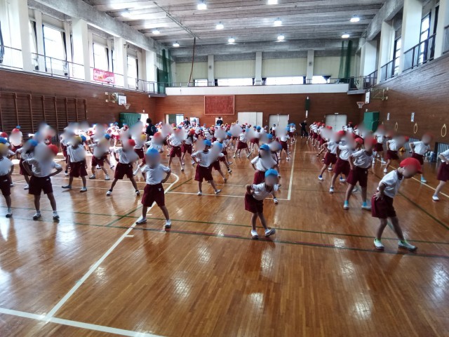 体育館で運動会のダンスの練習を行いました。子供たちは、とても楽しそうにダンスを踊っていました。本番には完ぺきにして、校庭で思いっきり踊ってくださいね。