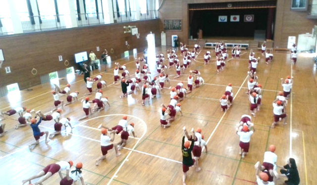 組立て体操の3人技の練習していました。先生がとる拍をしっかりと聞きながら、サッと動いて決める。練習を重ねながら覚える、覚えながらよりよいものにしていく。けがをしないように集中して取り組んでいました。