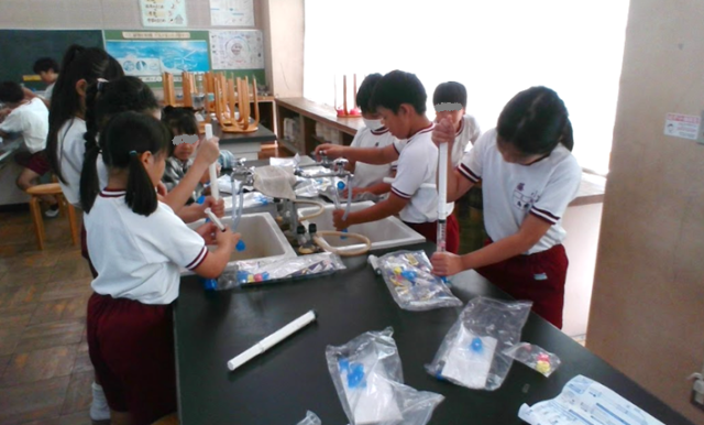 ピストンに空気や水をとじこめて押すと体積や手ごたえはどうなるか実験してきました。今日は空気と水の体積を半分ずつにして実験です。これまでに空気や水で実験して見つけたことをもとに、予想を立てながら実験です。一人一人実験に臨み、友達の様子も見合って気が付いたことを話し合っていました