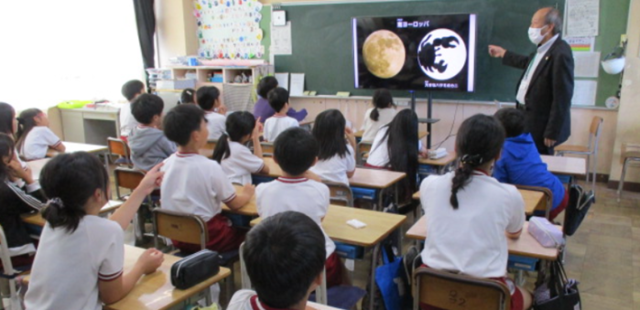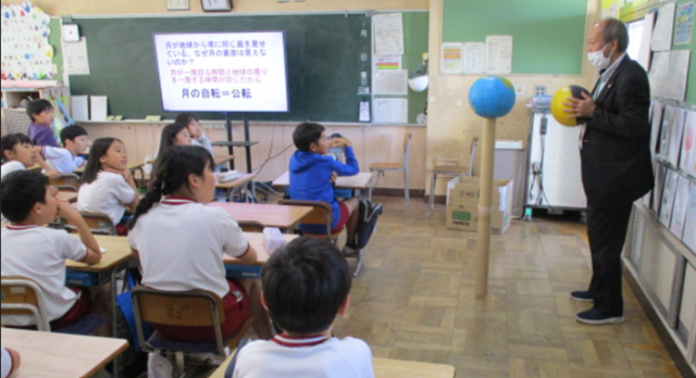 4年生の教室に行ってみると初任者指導の先生が特別授業を行っていました。月の裏側が地球から見えないのは…。月の見え方は国によって違う…。月は少しずつ地球から離れている…。テーマは「月」。こども達は興味津々。今日から月の見え方が変わったに違いありません。