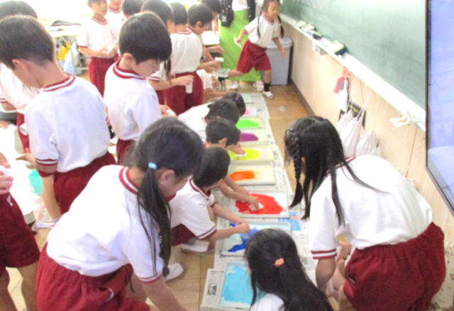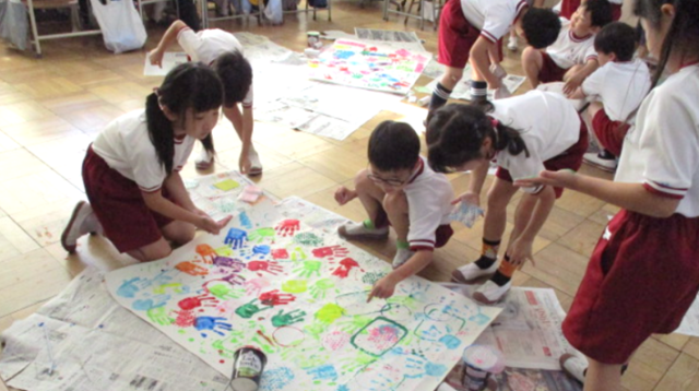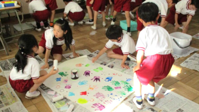 模造紙を広げて、スタンプ遊びの始まりです。8色の絵の具、スポンジ、トイレットペーパーの芯、アイスカップ、包装緩衝材、綿棒、厚紙、そして自分の手など。たくさんのものを使って、いろいろな形、いろいろな色、その組み合わせをみんなで楽しんでいました。次はどれにしようかな。どんどんにぎやかにカラフルになっていくグループの模造紙を見ながらちびっ子芸術家たちが腕を振るって大作を仕上げました。ご来校の際にぜひご覧ください。