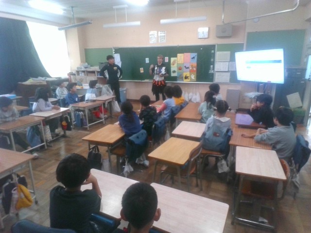 2年生 外国語 公開日 2025/10/24 更新日 2025/10/24 お知らせ もうすぐハロウィンです。ALTの先生が、紙芝居形式でハロウィンについて英語だけで説明をしていました。みんな英語が分かったかな。先生がお話していたことを家でも話してみてくださいね。
