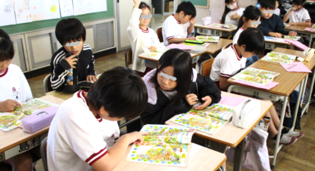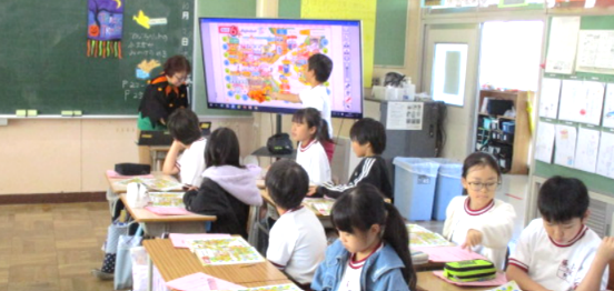 英語担当の先生とALTとで、ハロウィンに合わせて、英語でいろいろなモンスターが登場する紙芝居を紹介していました。二人の演技も抜群。繰り返し出てくるフレーズやイラストからストーリーを想像しながら楽しく聞いていました。その後も、小文字のアルファベットの学習も英語でクイズ的に聞き取り言葉を探す方法、楽しく聞き取る力が身に着く学習を行っていました。