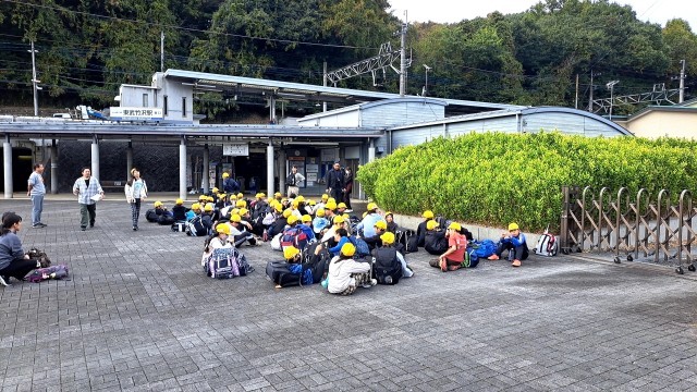 東武竹沢駅に到着しました。こども達は、まだまだ元気な様子です。座っている姿が、行きよりも成長したなと感じます。流石、藤小のこども達です。若葉駅までもう少しですので頑張りましょう。