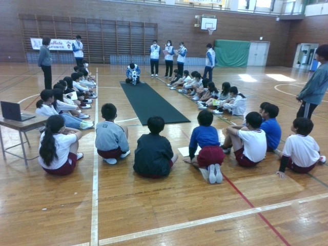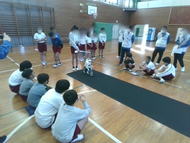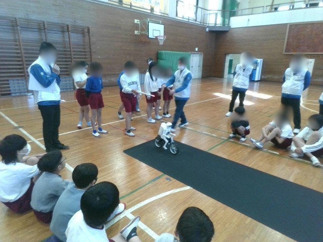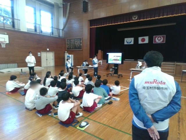 理科の出前講座で、ムラタ製作所の方々にお越しいただきました。前半は、スマートフォンやロボットに使われる電子部品やジャイロセンサー等について講義をしてくださいました。講義の中で、自転車ロボットと一輪車ロボットが登場し、特に一輪車ロボットが自立しているところを見たときには、子どもたちから歓声が上がっていました。後半では、子どもたちの数名が、実際に自転車ロボットを操れるマジックスティックを使い操作体験をしました。