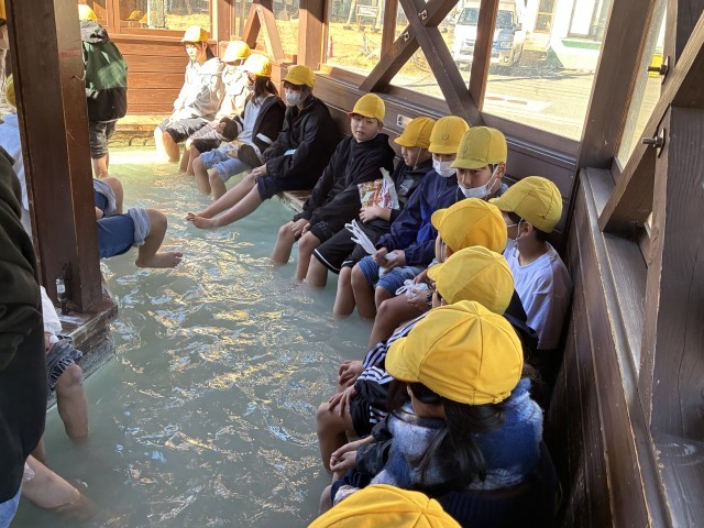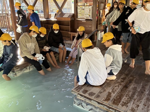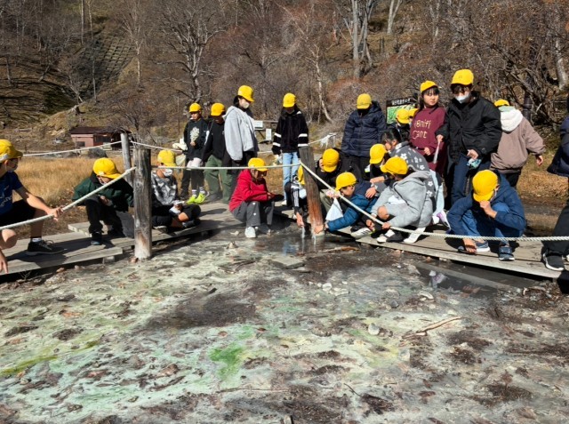 湯元温泉まで上がってきました。硫黄のにおいがあたりからします。まず源泉が湧き出ているところに行き、10円玉が温泉で変化するか実験をしました。その後、足湯で冷えた体を温めました。