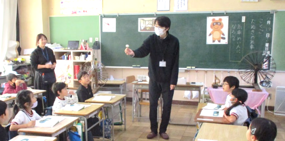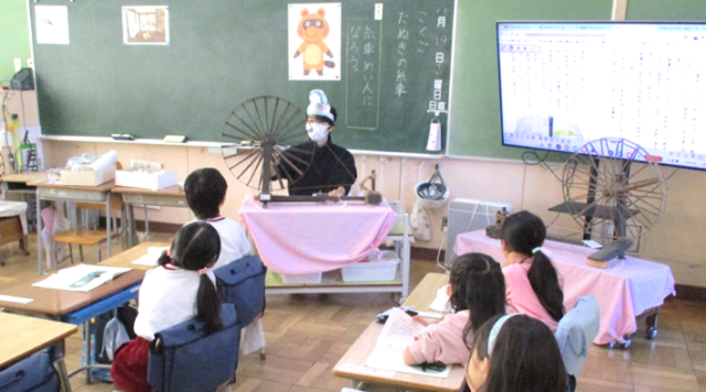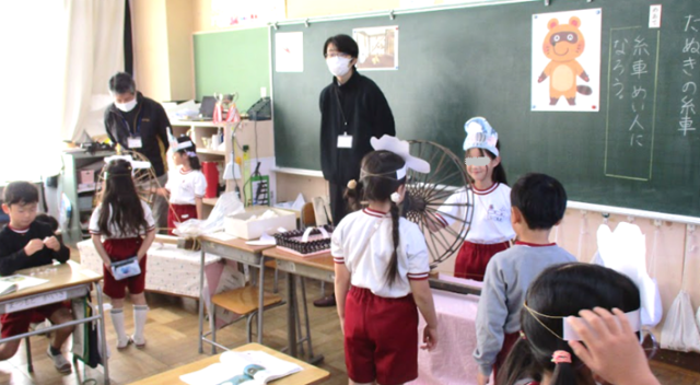 鶴ヶ島市文化財整理室から糸車をお借りして、糸車の実技体験です。おかみさんやタヌキになりきって体験していました。タヌキ役の人は糸車に合わせて目をぐるぐるとしていました。