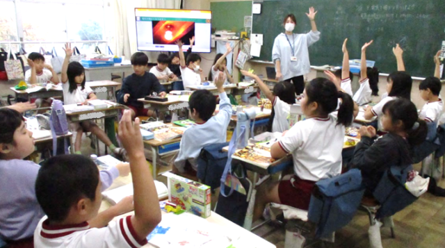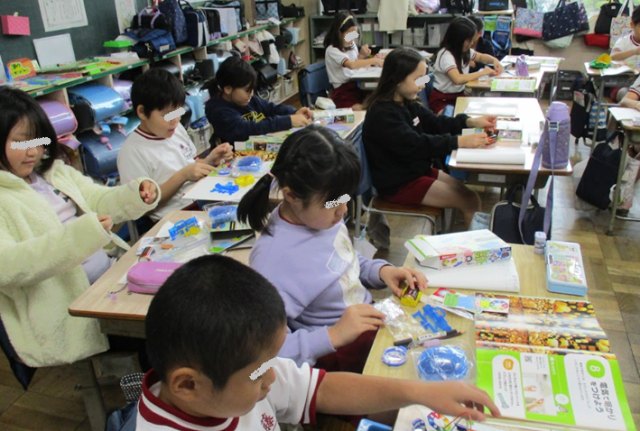 導線のついた豆電球を乾電池につなぐと、パッと明るい光がともりました。「ワー、ついた!」「暗いところでつけてみたい」「停電の時に役立つね」と光を見つめながら、これからの学習にワクワクいっぱいです。