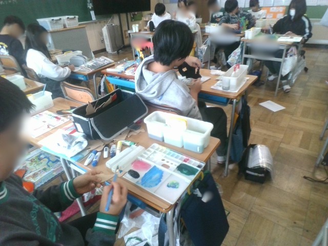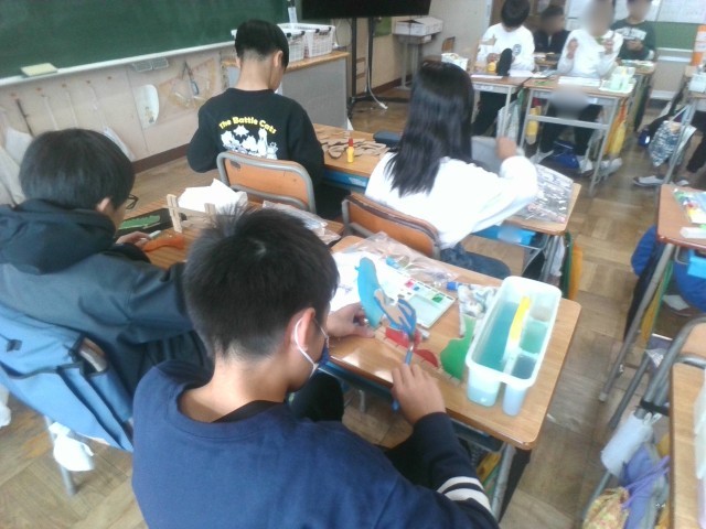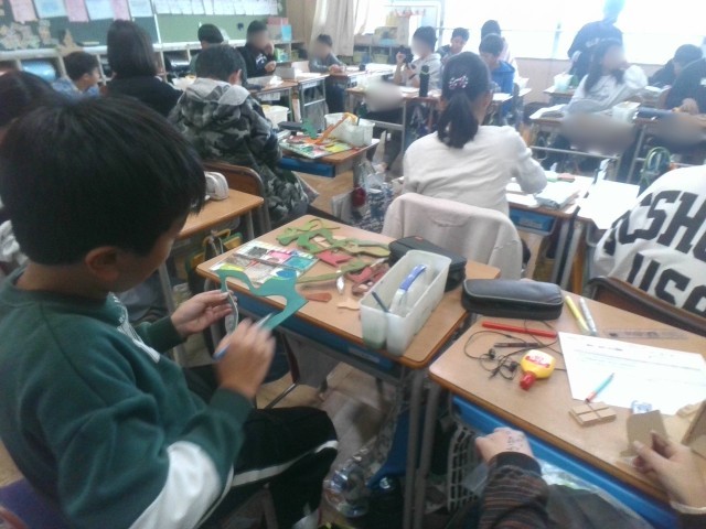 前回までの授業で、板から糸鋸で切り出した部品に色を塗ったり組み立てたりしていました。黒板には「唯一無二」の文字が書かれ、子どもたちは世界の何処にもない、オリジナルの作品を作っていました。お城を表現した作品や、動物の世界を表現した作品など、千差万別でした。どんな作品に仕上がるか、完成品がとても楽しみですね。