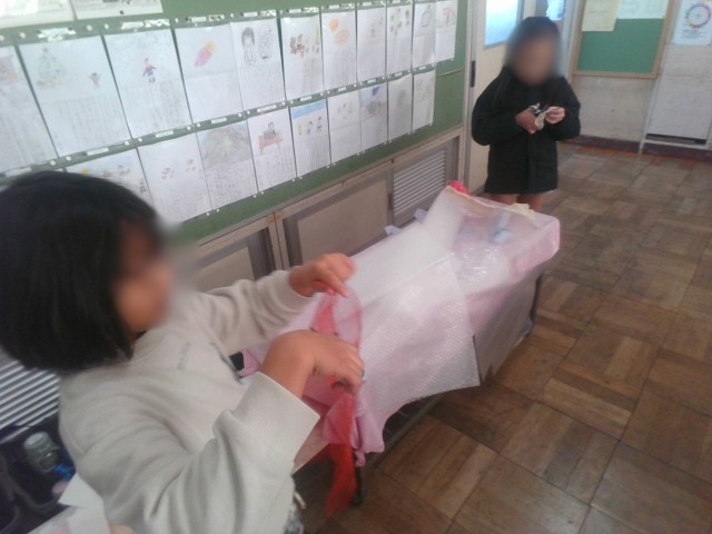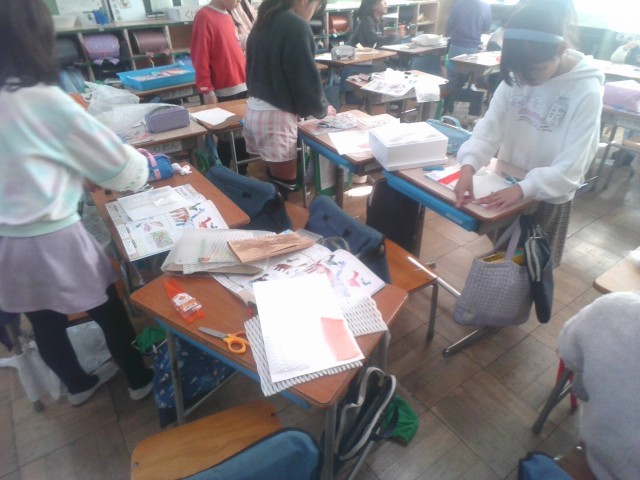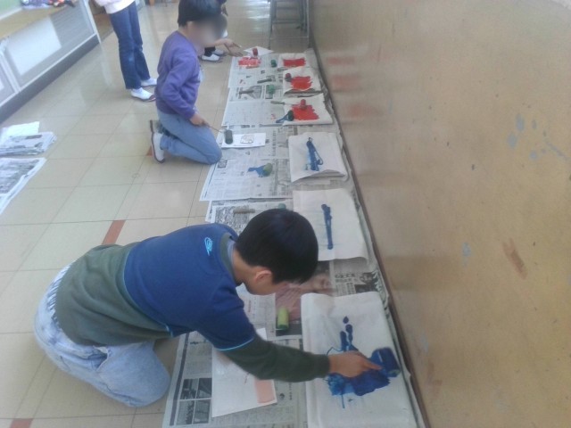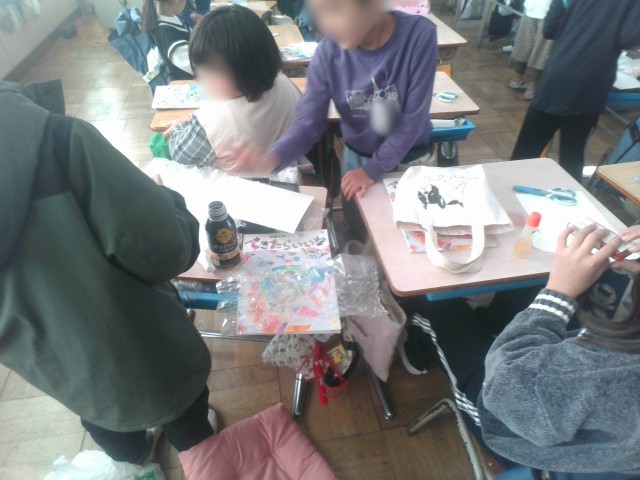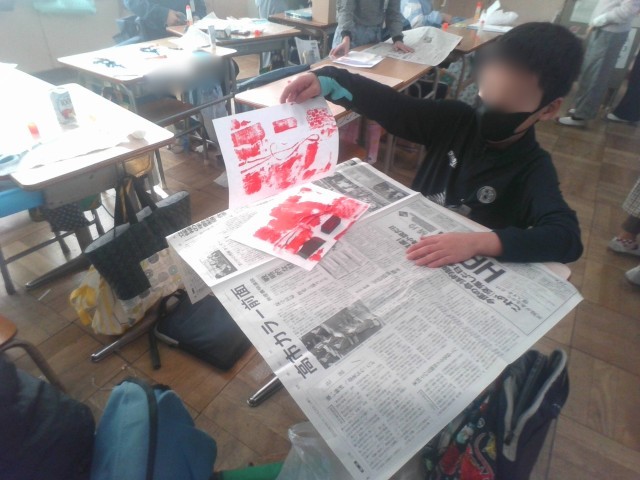 家から持ってきた糸やクッション材、網目の生地などを切って用紙に貼り、そこにインクを塗って模様を写し出す活動です。今日は第1時です。子どもたちは、型を作り、試し塗りをしていました。試しでもとても素敵な作品ができていました。次回の作品も見てみたいですね。