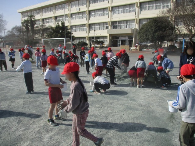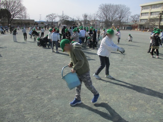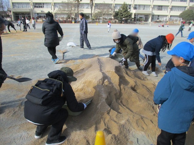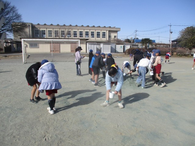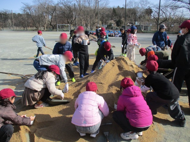 本日、全校奉仕作業が行われました。今回は校庭の整備として、ダンプカーで運ばれてきた山のようなグリーンダストと砂を、全校児童で協力して敷き詰めました。最初は大きな山に見えましたが、480人のパワーは凄まじく、あっという間に平らにならされていきました。また、学校応援団や保護者の皆様にも多大なるお力添えをいただき、大変スムーズに作業を進めることができました。ご協力、本当にありがとうございました。