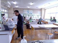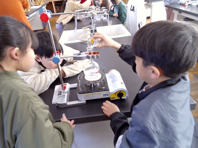 実験用のガスコンロに水と沸騰石を入れた丸底フラスコをセットし、加熱し続けると水がどのように変化するかを観察しました。子どもたちは友だちと協力しながら、熱心に実験に取り組んでいました。