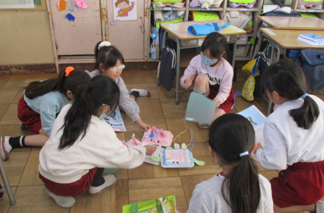 スチレン容器の切り方やかざりを工夫した思い思いのおもちゃ。ぱたぱたと、うちわや下敷きであおいで楽しんでいました。風を受けるとスーッと動いて大盛り上がりでした。