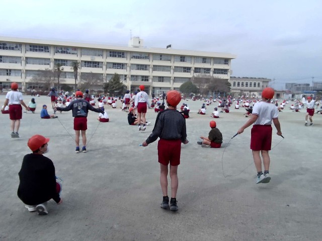 校庭で体育集会が行われました。今回の種目は「縄跳び」です。