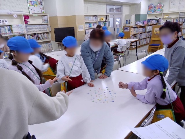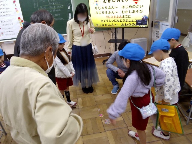 1年生の生活科の授業で「昔遊び体験」を行いました。各教室や図工室、図書室、家庭科室には、けん玉、福笑い、めんこ、ベーゴマ、おはじき、だるま落としの各コーナーが設けられ、子どもたちは自由に移動しながらさまざまな遊びに挑戦しました。保護者の皆様に加え、「昔遊びの先生」として藤金長寿会と菊寿会の皆様にもご来校いただきました。地域の方々からコツを教わりながら、子どもたちは目を輝かせて昔遊びを楽しんでいました。