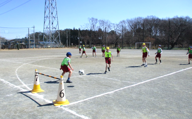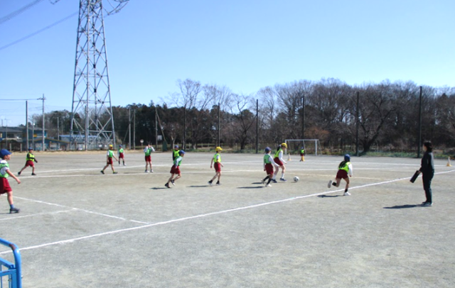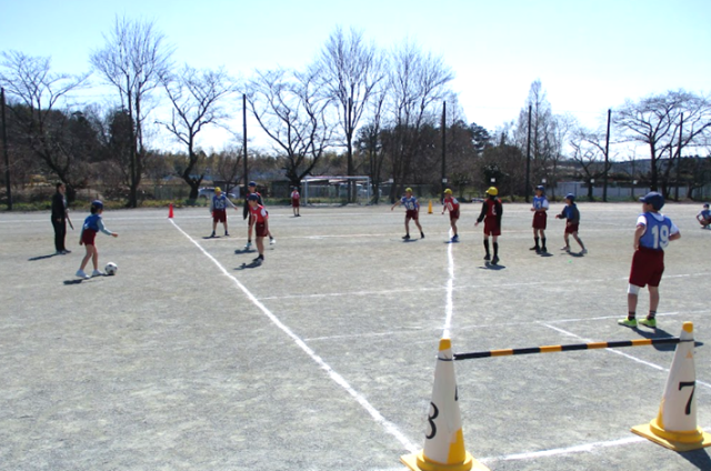 4年生がラインマンがいるラインサッカーをしていました。コート外のラインマンを上手に使ってボールをパスしてゴールを狙っていました。
