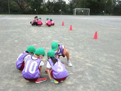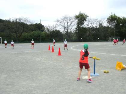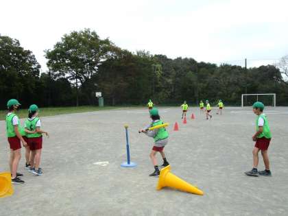 ベースボール型ボールゲーム「ティボール」に取り組んでいます。ティにおいたボールを打って、カラーコーンを回って、相手が捕球し決められたサークル内にボールを運ぶまでに、ホームベースに戻ってくれば得点となります。初めは思うようにバットがボールに当たってくれませんでしたが、少しずつ当たるようになりました。攻めるとき、守るときの作戦を立て、勝利を目指してがんばるぞー