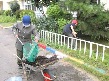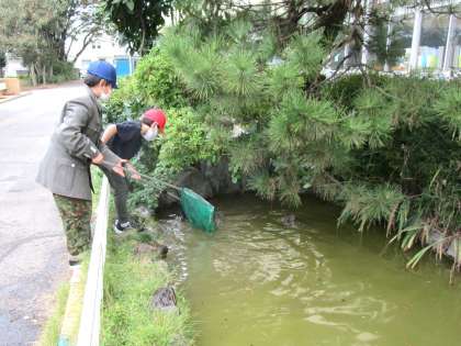 ふじのこのみんなが藤小の池を掃除してくれました。松の木の下は枝や松葉でいっぱいです。ごみをすくっていたらフナやヤゴを捕まえました(ヤゴがどこにいるか分かるかな)。職員玄関に置いてある水槽の魚たちも、ふじのこのみんながお世話をしてくれています。どうもありがとう。