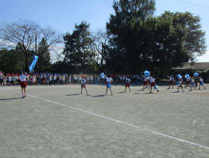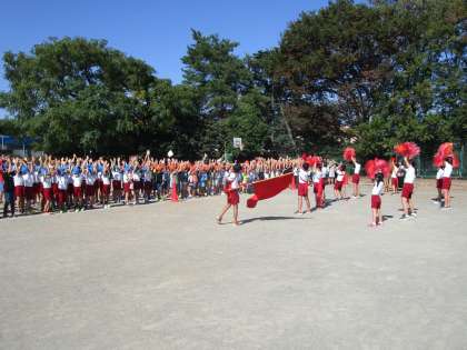 運動会の応援団結団式が行われました。初めに応援団長・応援団員から大きな声で自己紹介がありました。続いて、フレフレコールなど、早速、元気な応援練習が始まりました。赤組合言葉「日の丸のように赤く力強く団結して赤組優勝かちとるぞ」、青組合言葉「青組みんなで本気を出して空に勝利のにじをかけよう」のもと、両チームとも力を合わせ頑張ってください。