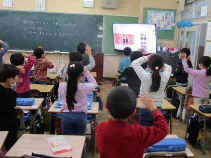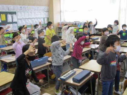 県立特別支援学校に通う友達を迎えて、一緒に音楽の学習をしました。今日が2回目の交流になります。初めはみんなの元気にびっくりしていましたが、みんなが動画を見ながらパプリカを踊り出すと、一緒にリズムに合わせて体を動かしていました。