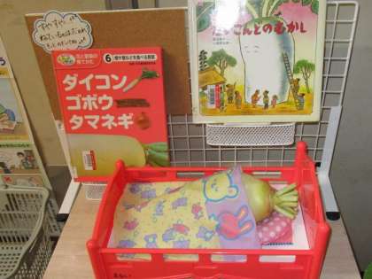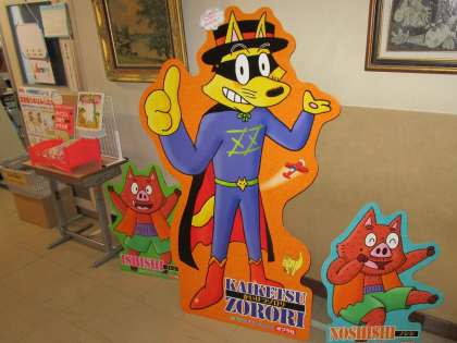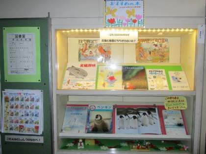 11月の読書月間にはたくさんの本に触れた子供たち。さらに図書好きな子供たちになるように、図書室のろう下には、定期的になぞなぞを出題。そのなぞなぞに関連する図書を展示して、子供たちが少しでも本に興味がわくように工夫しています。図書室の入り口には、子供たちが大すきなかいけつゾロリがお出迎えです。