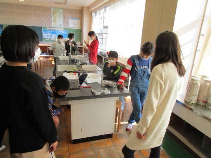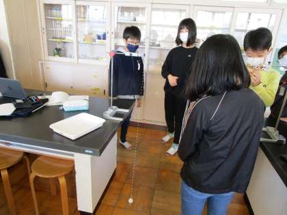 ふりこの周期は、何で決まるのか。ふりこの長さ、振れ幅、おもりの重さについて、条件を1つずつ変えてきまりを見つけます。今日はふりこの長さだけを、25cm、50cm、75cmと変えて調べていきます。あるグループは予想を立てて125cmで確かめていました。