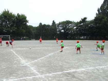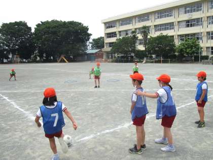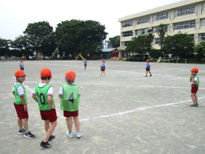 3年生 体育 キックベース 公開日 2022/06/21 更新日 2022/06/21 お知らせ どうすれば点が取れるのか、どうすれば点をあげずにすむのか。緑チームは相手のチームの守りを見て、後半、守り方を変えてきました。「ボールを取ったら決められたフラフープの中に集まる」というルールがあります。初めは速く集まるという作戦でしたが、試合を進める中で、確実にボールを止めるという作戦に変わってきていました。