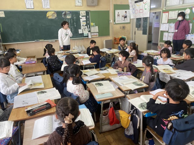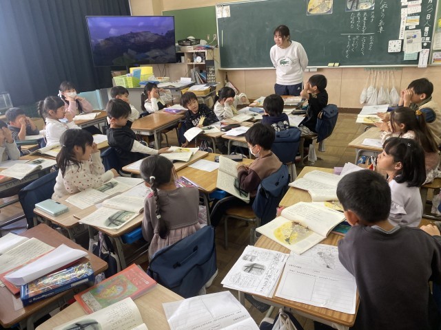 学習の要素を見ようと後ろのドアから入っていくと、ちょうどタイミングよくみんながこちらを振り向きました。ドアの音がしたからと思いましたがどうやら、「たぬきの糸車」で、おかみさんが糸車の音がしたので振り向く場面をみんなで演じていたようです。その後も、「そっとのぞく」ってどんな様子と先生が聞くと、指でメガネの形を作ったり、手を戸や壁の代わりに頬の横に手をくっつけてわいい素振りを見せてくれました。