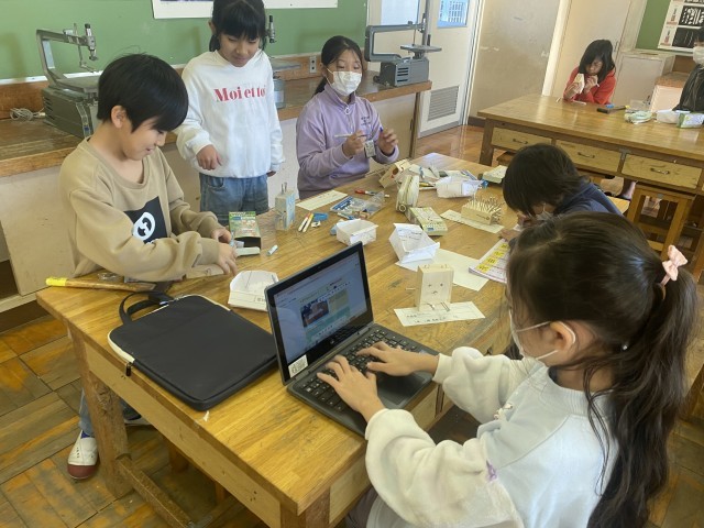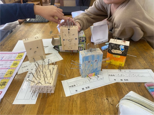 このところ、トントントンとにぎやかな音が聞こえると思ったら、3年生が図工でくぎ打ちの経験を積みながら楽しい仲間たちの創作活動中でした。たくさんの、長さも違うくぎをいろいろな方向に打ち込んだり、まげてみたりと、いろいろな友達ができ曲がりました。何やら楽しい会話が聞こえてきそうです。
