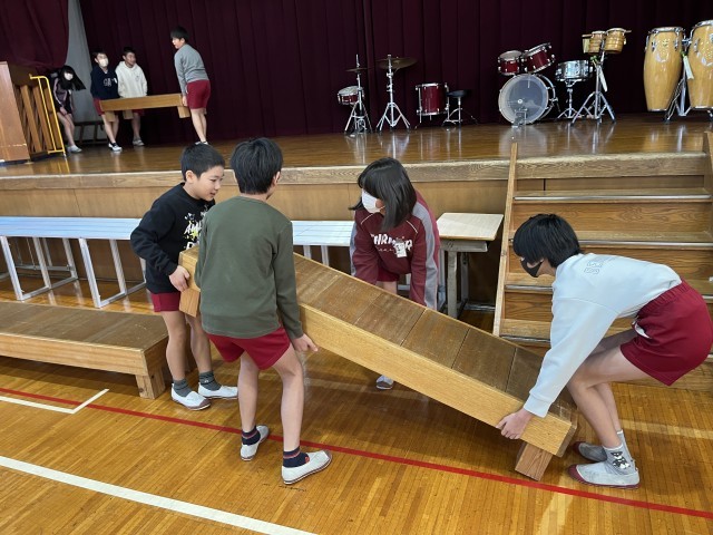 本日の1時間目の時間と業間休みを使用し、6年生が土曜日に開催される音楽学習発表会に向けての楽器運びとひな壇作りを行ってくれました。安全に・素早く・キビキビと・・・作業量も多くありましたが、6年生にかかれば何のその・・・あっという間に準備も整いました。本当にありがとう!いつも助かっています。