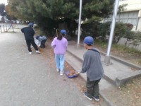 4年生の子どもたちが箒や塵取りを持って校庭で落ち葉拾いをしていました。子どもたち...
