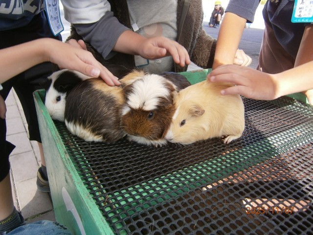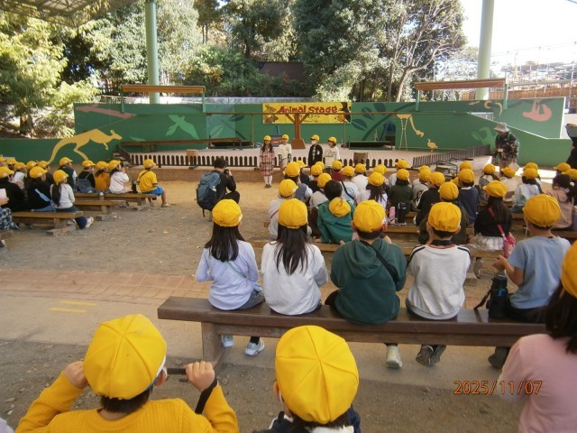 本日、1・2年生は東松山市のこども動物自然公園に校外学習に行きました。天気がよく、多くの学校や幼稚園が来園していました。南小の1・2年生はたてわりの班をつくり、2年生が1年生と手をつないで、1年生のペースでポニーやキリン、コアラなどいろいろな動物見て回りました。また、最後にはふれあいコーナーにてモルモットを撫でて、癒されました。2年生が1年生に優しく声をかけている姿がとてもお兄さんお姉さんに見えて立派でした。