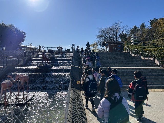 動物公園に着きました。こちらも紅葉がとても綺麗です。子供たちは早く動物に会いたくてワクワクしています。班行動の約束を確認して、いよいよ出発です。