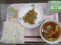 ★今日のメニュー★・肉汁うどん・牛乳・小松菜のごま炒め・鶴茶ん給食で【鶴茶ん】が...