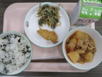 ★今日のメニュー★・わかめごはん・牛乳・肉じゃが・あじフリッター・ほうれん草のご...
