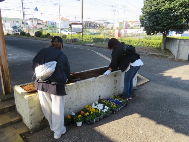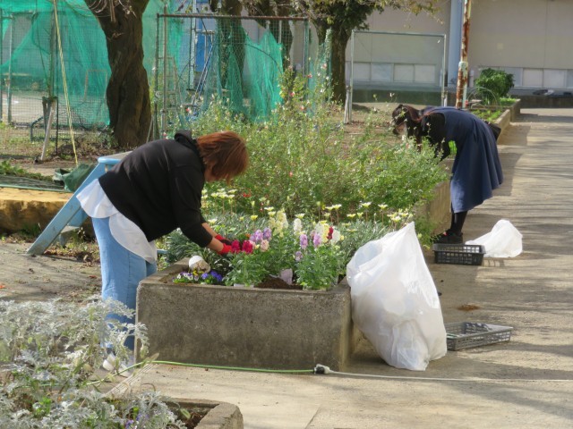 本日、PTA環境委員とボランティアの方々に花壇の手入れをしていただき、お花を植えていただきました。