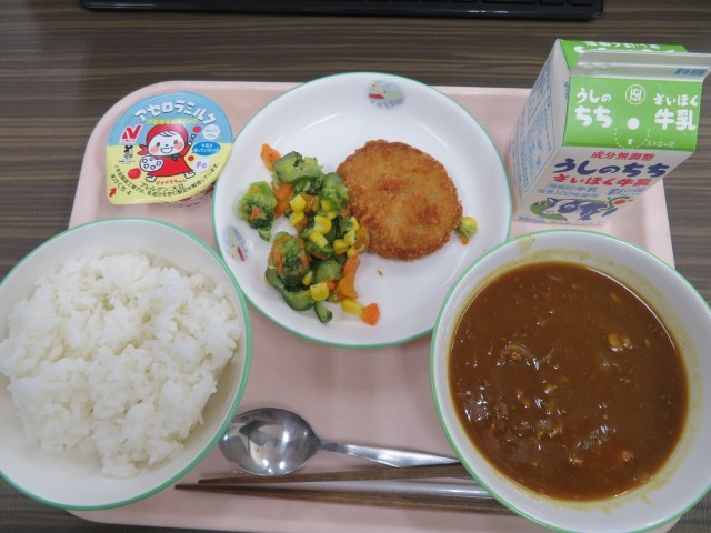 専用のルウを使い、なんと具は玉ねぎと肉のみであることが条件だそう。今年の夏休みに給食センターで試作を行い、辛さや玉ねぎの炒め具合を調整してできたカレーです。確かにいつもとは違ったカレーでしたよね。ピリッとした辛さが奥に控え、ごはんとはもちろん、ヒレカツとの相性もばっちりでした!!