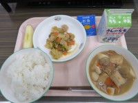★今日のメニュー★・ごはん・牛乳・鶴茶すいとん・ソイ(白身魚)の竜田揚げ・糸こん...
