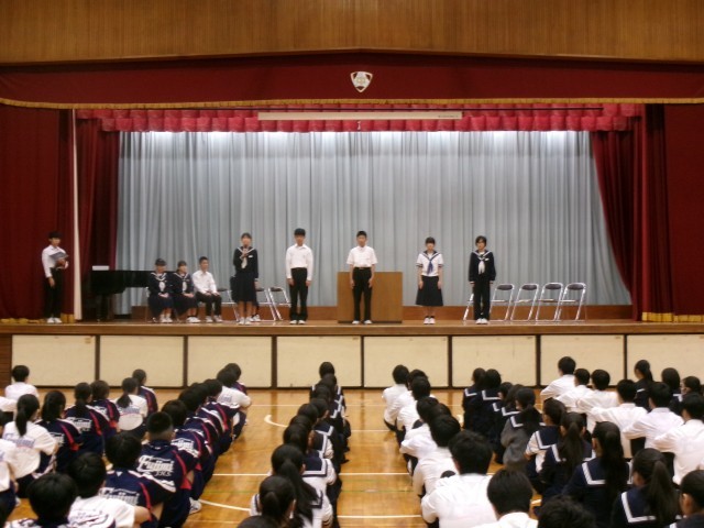 任命式 公開日 2025/10/15 更新日 2025/10/15 お知らせ 10月15日(水)の朝は、新生徒会本部の任命式が行われました。校長先生からは、任命された本部役員の生徒たちを含む全校生徒に向けて、激励の言葉が贈られました。