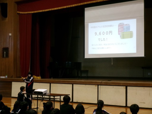 生徒会本部からは、アルミ缶回収やコンタクトケース回収の説明と協力への感謝が伝えられました。