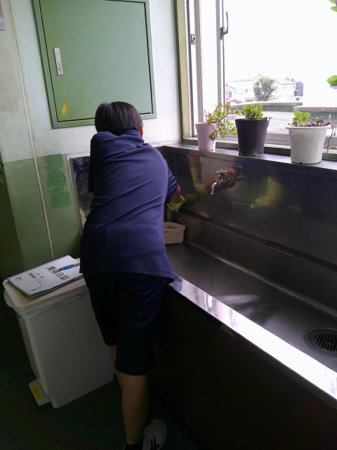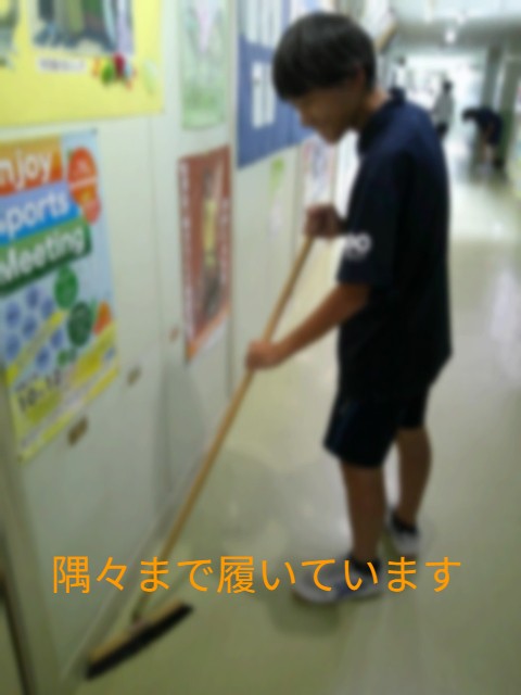 職員室前の廊下を黙々と、そして隅々まで掃除する清掃マスターたち