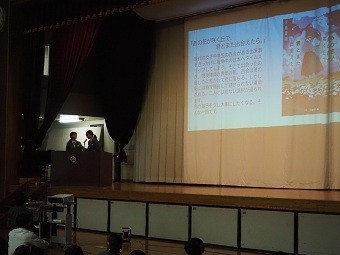 「ビブリオバトル We love reading!」 と題し、南中学校図書室にある本の中から図書委員がお薦めする4冊の本が紹介されました。