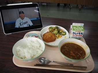 西武ライオンズの選手からのメッセージ動画を視聴しながら、いただきました。もちろん、食缶は空っぽ。ごちそうさまでした!